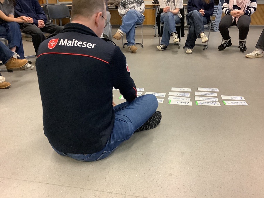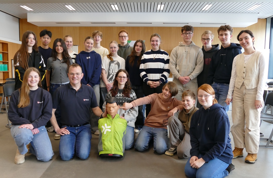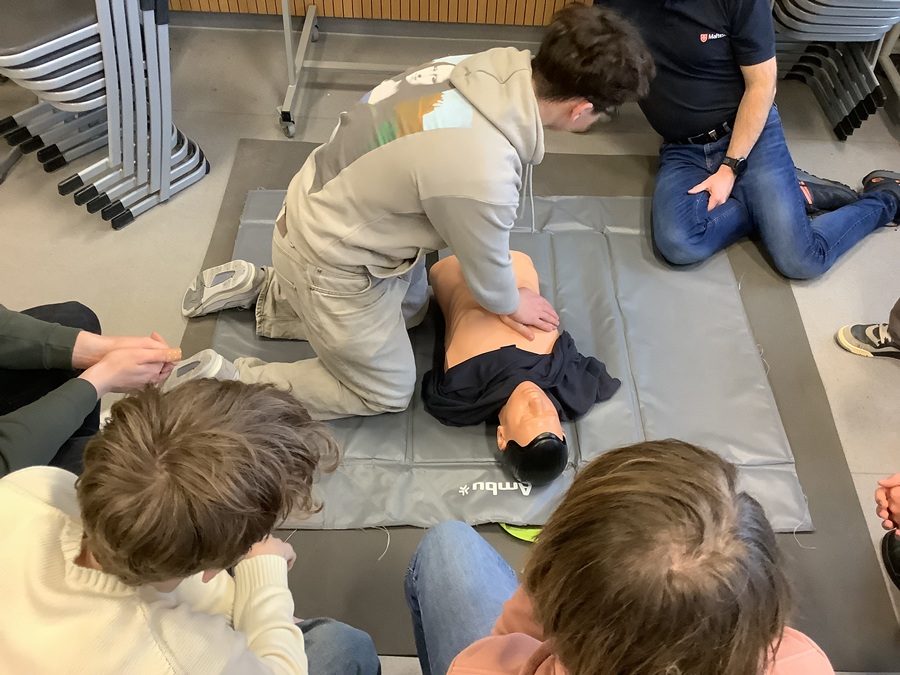 Am Mittwoch, den 28. Januar fand der Erste-Hilfe-Kurs unserer Sani-AG statt. Michael Volmert schulte als Kursleitung der Malteser Borchen 20 Schüler:innen praxisnah im Umgang mit Notfallsituationen – von lebensrettenden Sofortmaßnahmen bis hin zur Versorgung kleinerer Verletzungen.