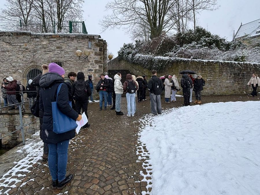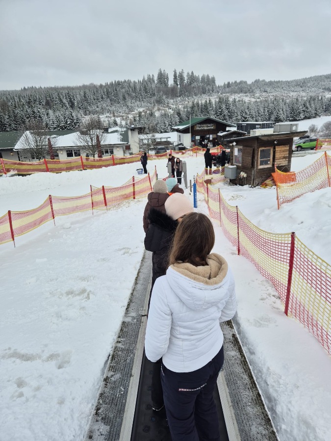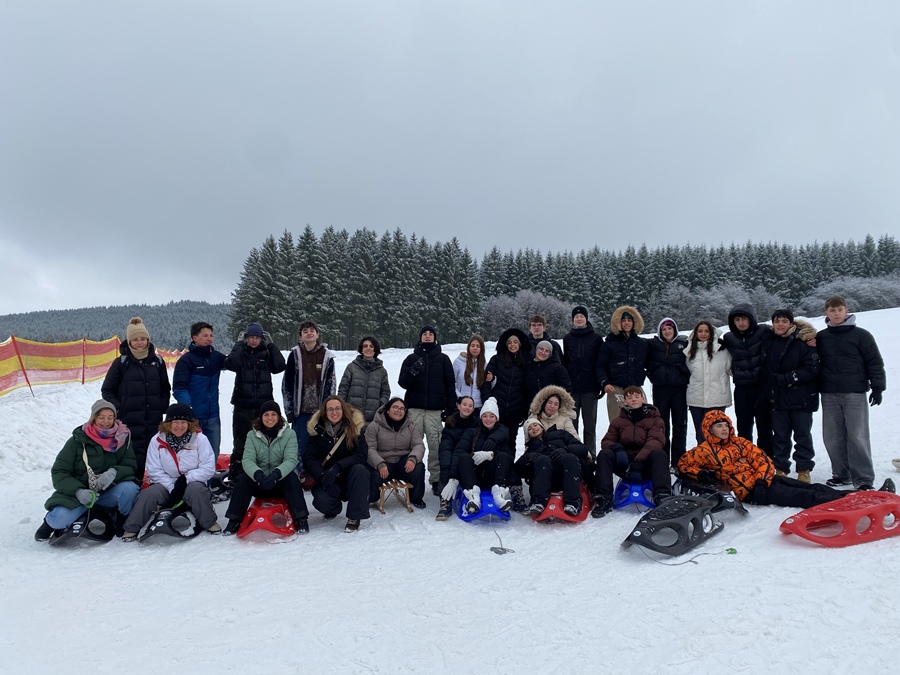 Besonders interessant waren seine Beispiele zur Nutzung der Skipisten. Diese werden im Winter möglichst ressourcenschonend beschneit, während sie im Sommer als Wander- und Mountainbike-Strecken dienen. Außerdem berichtete er, dass sich auf den Pisten zunehmend Pflanzenarten von selbst regenerieren, was zeigt, dass Natur und Tourismus nicht im Widerspruch stehen müssen. Im Anschluss erkundeten wir in kleinen Gruppen die Innenstadt von Winterberg. Dabei machten wir uns Notizen zum Tourismus vor Ort und beobachteten, wie stark die Stadt auf Besucherinnen und Besucher ausgerichtet ist. Am Nachmittag fuhren wir gemeinsam zu einer nahegelegenen Piste, um dort Schlitten zu fahren. Für viele der Austauschschüler:innen aus Ibiza war es das erste Mal, Schnee direkt zu erleben. Nach rund zwei Stunden im Schnee machten wir uns schließlich wieder auf den Rückweg nach Paderborn. Der Tag half uns, besser zu verstehen, wie nachhaltiger Tourismus in einer beliebten Wintersportregion umgesetzt werden kann.
