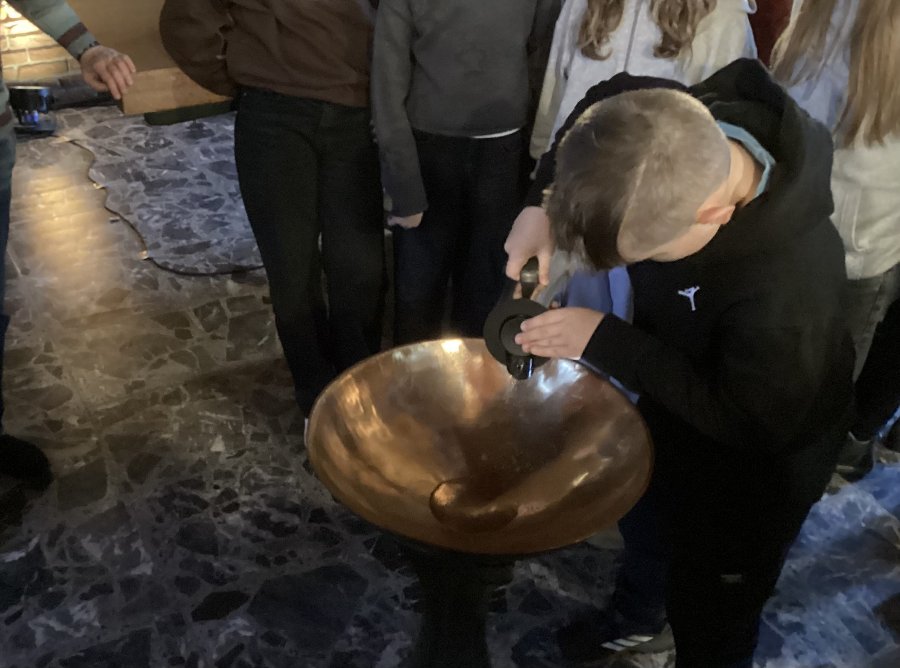 Die zweite Gruppe erkundete die katholische Kirche St. Georg. Dort empfing Dr. Haunerland die Schüler:innen bereits vor der Kirche und erläuterte die Geschichte und Architektur des beeindruckenden Bauwerks. Im Kircheninneren entdeckten die Lernenden verschiedene Stationen: vom Taufbecken über den kunstvoll gestalteten Altarraum bis hin zu den farbenprächtigen Fenstern, die bei Sonnenschein in besonderem Licht erstrahlen. Auffällig waren die Farben Gelb und Rot. Dieses prächtige Farbenspiel für die Sinne war auch während der Kirchenbesichtigung in St. Georg wahrzunehmen und tauchte die Kirche für die Sechstklässler:innen in eine ganz besondere voradventliche Atmosphäre. Außerdem erfuhren die Schüler:innen, warum die Kirche den Namen des heiligen Georg trägt, der als Märtyrer für Mut und Glauben steht, warum St. Georg an ihrem heutigen Standort gebaut wurde und welche ursprüngliche Funktion sie in ihrer früheren Vergangenheit erfüllte. Die Führung schlug Brücken zu zentralen Themen des christlichen Glaubens wie Pfingsten, die Arche Noah, den Apostel Petrus und den Paderborner Schutzpatron Liborius.