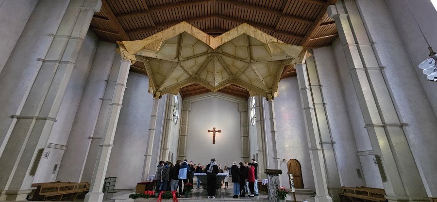 Eine Gruppe besuchte das evangelische Johanniszentrum, wo Pfarrerin Walter die Führung übernahm. Sie erklärte die Bedeutung der evangelischen Tradition und zeigte, wie sich diese in Architektur und Ritualen widerspiegelt. Dabei ging sie auch auf Gemeinsamkeiten und Unterschiede zwischen evangelischen und katholischen Kirchen ein. Besonders spannend war für die Schüler:innen die Möglichkeit, Fragen zu stellen und so eine gelebte Ökumene zu erfahren.