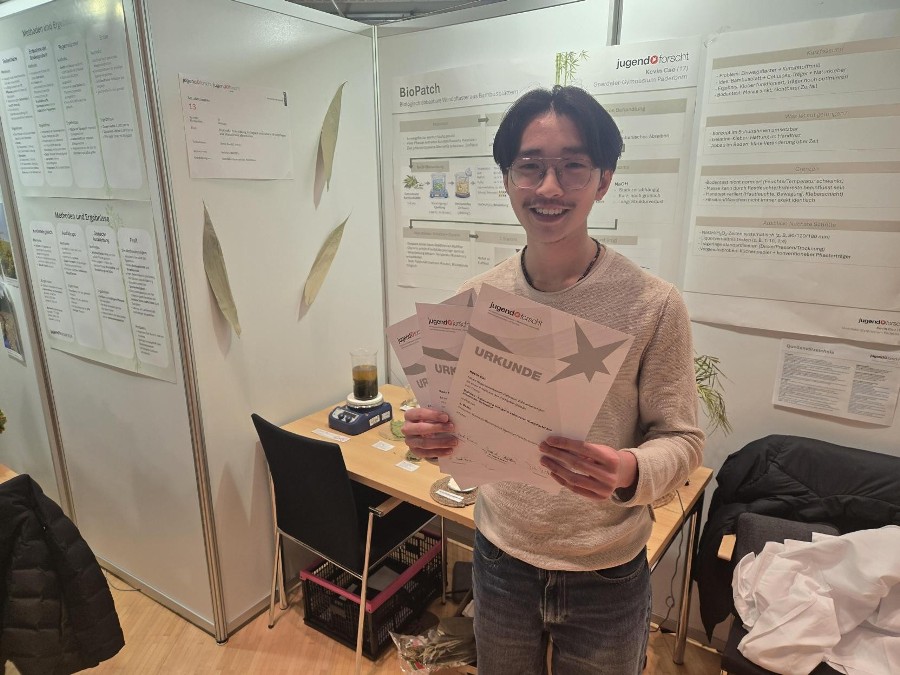 Kevin Cao hat sich in seiner Arbeit „BioPatch – Entwicklung biologisch abbaubarer Wundpflaster aus pflanzlichen Materialien” mit der Frage beschäftigt, ob Pflanzen basierte Pflaster eine nachhaltige Alternative zu den Pflastern aus erdölbasierten Kunststoffen, die nur sehr schwer abbaubar sind, sein könnten. Dazu hat er sich mit Bambusblättern beschäftigt, das Blattmaterial aufbereitet, gereinigte Cellulose gewonnen und parallel einen pflanzlichen hautverträglichen Klebstoff entwickelt.