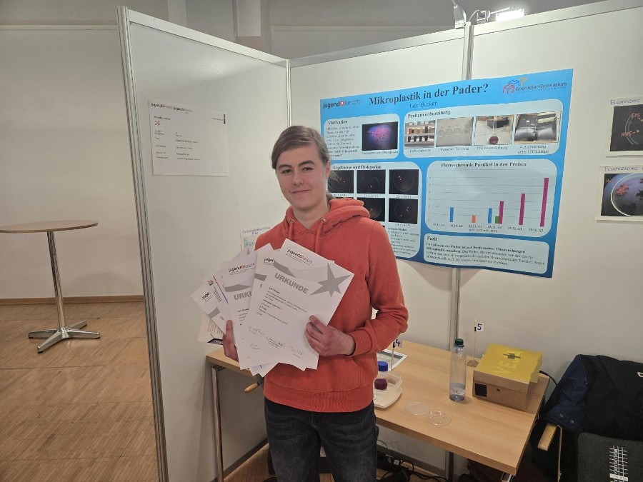 Für ihre Projektarbeit „Mikroplastik in der Pader?“ erhält sie den Sonderpreis „Umwelt” des LANUK und den Sertürner-Preis der Stadt Paderborn. Außerdem wurde sie mit dem zweiten Preis im Fachgebiet Chemie ausgezeichnet.