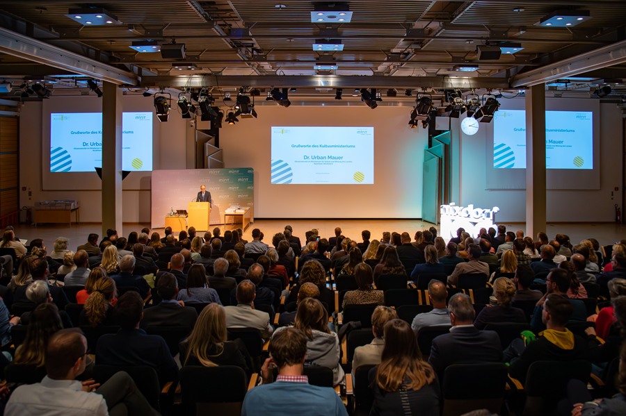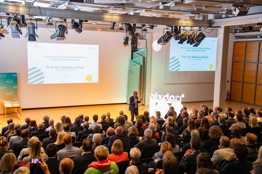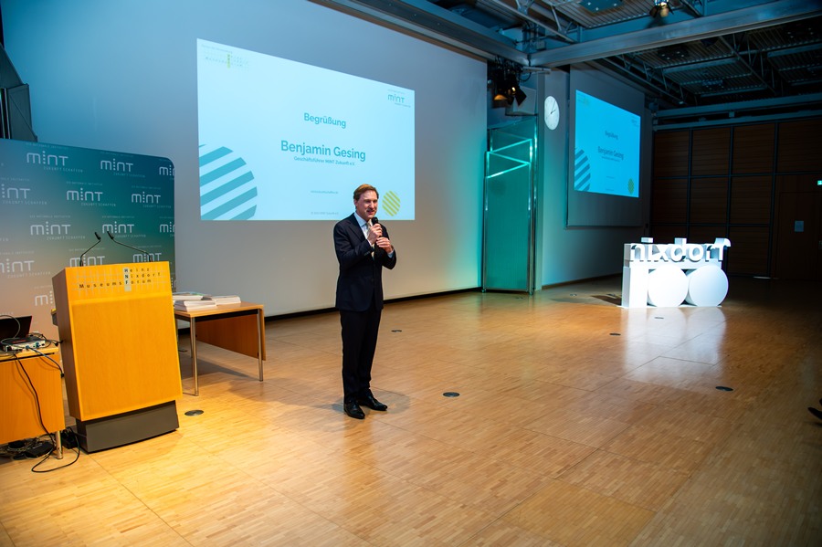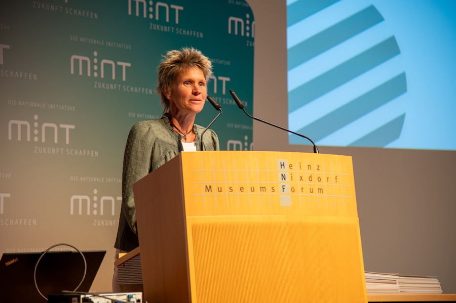 Grußworte sprachen darüber hinaus auch die Paderborner Gastgeber, etwa Dr. Jochen Viehoff, (Geschäftsführer Heinz Nixdorf MuseumsForum) und Prof. Dr. Nikolaus Risch (Vorstand der Heinz Nixdorf Stiftung). Auch Sabine Kramm als stv. Bürgermeisterin von Paderborn überbrachte Anerkennung und Glückwünsche: „Die heute geehrten MINT-Schulen verdienen unseren höchsten Respekt – sie leisten herausragende Arbeit für unsere Kinder und Jugendlichen. Als Universitätsstadt ist Paderborn ein idealer MINT-Nachwuchspol: Unsere ausgezeichneten Schulen arbeiten Hand in Hand mit der Universität und Unternehmen wie dSPACE und Benteler zusammen. Partnerschaften wie diese zwischen Bildung, Forschung und Wirtschaft macht Ostwestfalen-Lippe zu einer der innovativsten MINT-Regionen Deutschlands.“