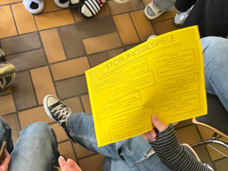 In Gruppen wurde diskutiert, wie auf Störungen und Herausforderungen reagiert werden kann. Im gemeinsamen Austausch wurde geklärt, wie zum Beispiel mit folgender Situation umgegangen werden sollte: Ein Schüler sagt bei einem Spielenachmittag „Boah, ich hab keinen Bock mehr. Ich will einfach nach Hause!“