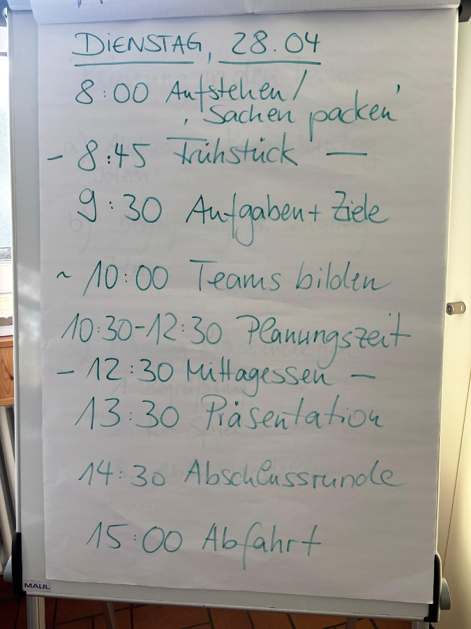 Nach dem leckeren Frühstück und einem Kooperationsspiel ging es am zweiten Tag in die aktive Planungsphase. Es bildeten sich die Pat:innenteams, die dann Aktionen für den Kennenlernnachmittag und gemeinsame Klassenunternehmungen für ihre Schüler:innen im ersten Halbjahr entwickelten.