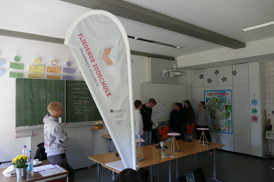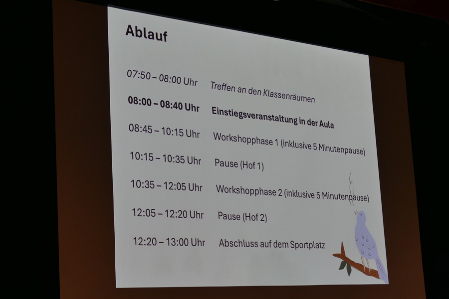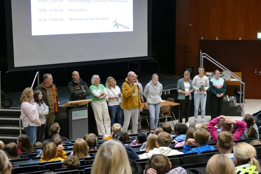Der Tag war fächerübergreifend angelegt und knüpfte insbesondere an die Inhalte des Biologie-Lehrplans zum Thema Artenschutz an. Beim gemeinsamen Auftakt in der Aula begrüßten Frau Ziemer und Frau Witte, die den Projekttag initiiert und organisiert hatte, alle Teilnehmenden. Sie betonte, dass in einer Zeit, in der der Verlust der Artenvielfalt und der Schutz von Lebensräumen zu den drängendsten Aufgaben unserer Gesellschaft gehören, es ganz zentral sei, für diese Themen zu sensibilisieren. Der besondere Dank galt den sieben Vereinen und Institutionen, die sich in der Aula zunächst allen Klassen vorstellten und dann in zwei Workshopschienen für die neun Klassen ein abwechslungsreiches und aktivierendes Programm gestalteten. Zudem boten unsere schulische Tierschutz- und die Pflanzen-AG ebenfalls Workshops an. Die Workshops im Überblick: