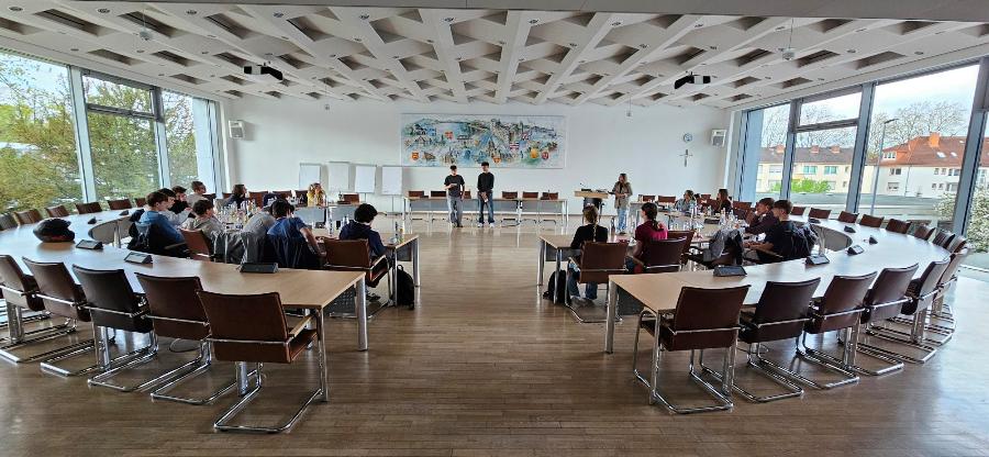 Ein besonderes Highlight gleich zu Beginn war der Veranstaltungsort selbst: Die Exkursion startete im Plenarsaal der Kreisverwaltung Paderborn. Der außergewöhnliche Rahmen vermittelte den Schüler:innen einen authentischen Eindruck von kommunaler Selbstverwaltung und politischen Entscheidungsprozessen auf Kreisebene.