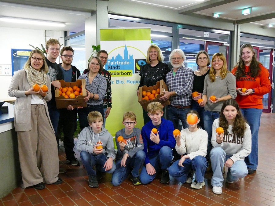 Die Steuerungsgruppe der Fairtrade Stadt Paderborn hat unserer Schüler:innengenossenschaft zwei Kisten „Faire Orangen“ aus der Aktion „Süß statt bitter“ überreicht: „Wir wollen damit „Danke“ sagen für das Engagement bei der gemeinsamen Veranstaltung „Auf dem Weg zur Fairtrade School“ am 27.09.2025 im Rathaus Paderborn.“