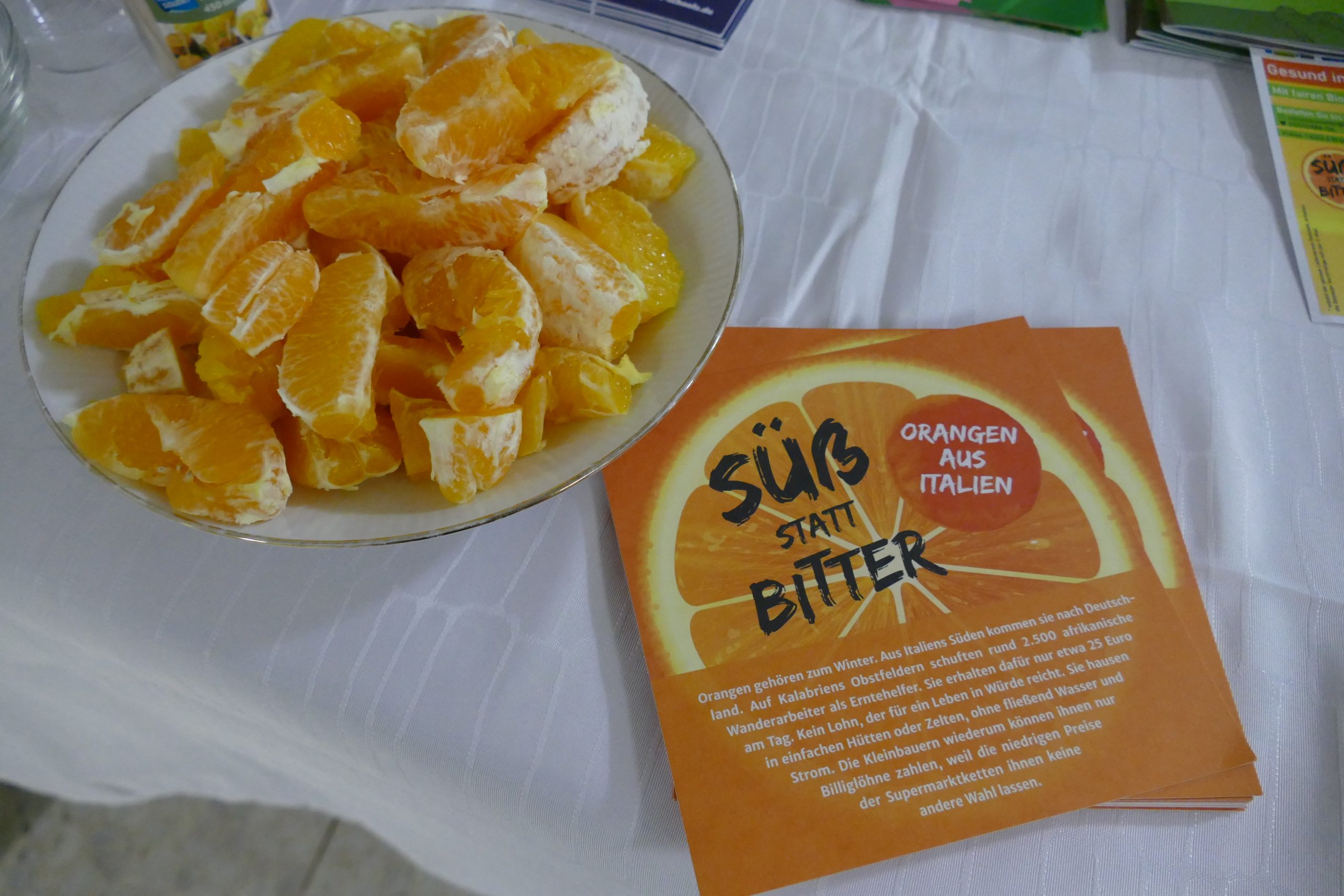 Auch beim fairen Pausenverkauf werden die Orangen weitergegeben und Spenden gesammelt für Projekte wie sichere Unterkünfte oder Fahrradlampen für die Erntehelfer.