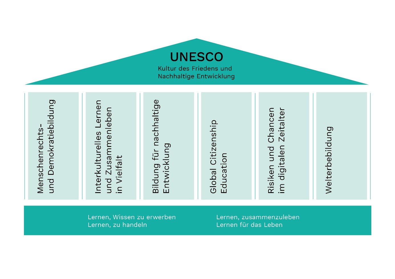 Daher haben uns Ende 2023 an das Netzwerk der UNESCO-Projektschulen gewandt und um eine Aufnahme als interessierte Schule gebeten, weil die Zielsetzungen des Netzwerks und seine Ideale genau zu der Entwicklung der Schule passen. In vielen Projekten, Aktionen und Aktivitäten in und außerhalb des Unterrichts engagieren wir uns in den Bereichen, die durch die Säulen des Leitbildes der UNESCO-Projektschulen besonders veranschaulicht werden.