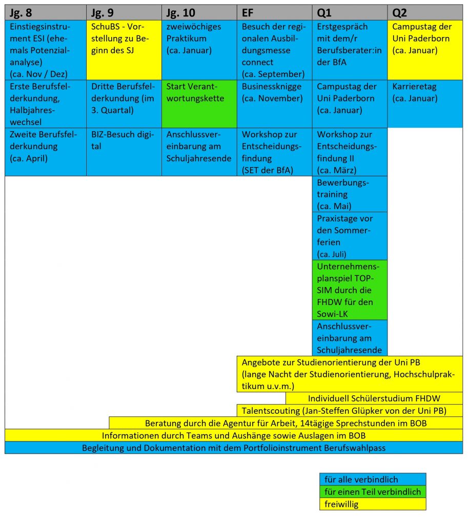 Die Studien- und Berufsorientierung unterstützt unsere Schüler:innen dabei, frühzeitig eigene Stärken zu entdecken und eine fundierte Entscheidung für ihren weiteren Bildungs- und Berufsweg zu treffen. Ziel ist es, Orientierung zu geben, Perspektiven zu eröffnen und den Übergang von der Schule in Studium, Ausbildung oder andere Bildungswege gut vorzubereiten. Als Gymnasium in Nordrhein-Westfalen setzen wir das Landesprogramm KAoA – „Kein Abschluss ohne Anschluss“ um. KAoA sorgt dafür, dass alle Schüler:innen ab der Jahrgangsstufe 8 eine systematische und verbindliche Berufs- und Studienorientierung durchlaufen. Dazu gehören unter anderem das Einstiegsinstrument ESI, mehrere eintägige Berufsfelderkundungen (Praktikumstage), mehrwöchige Praktika sowie Informations- und Beratungsangebote.