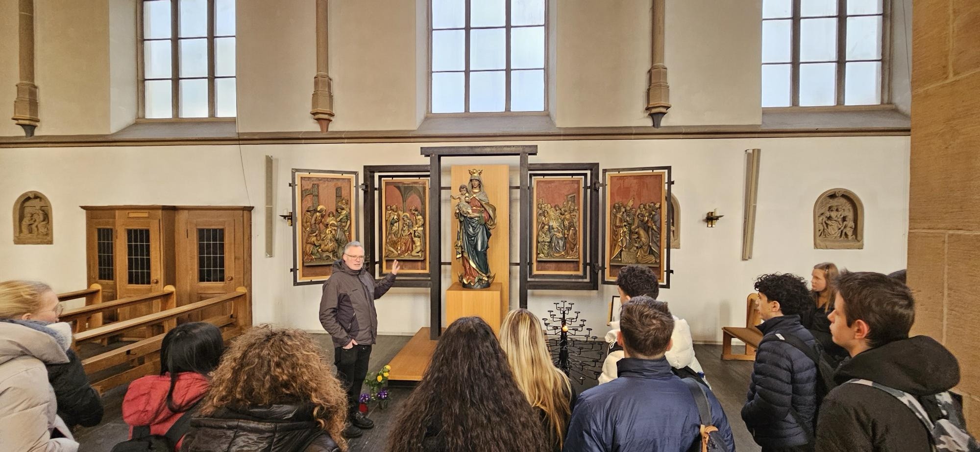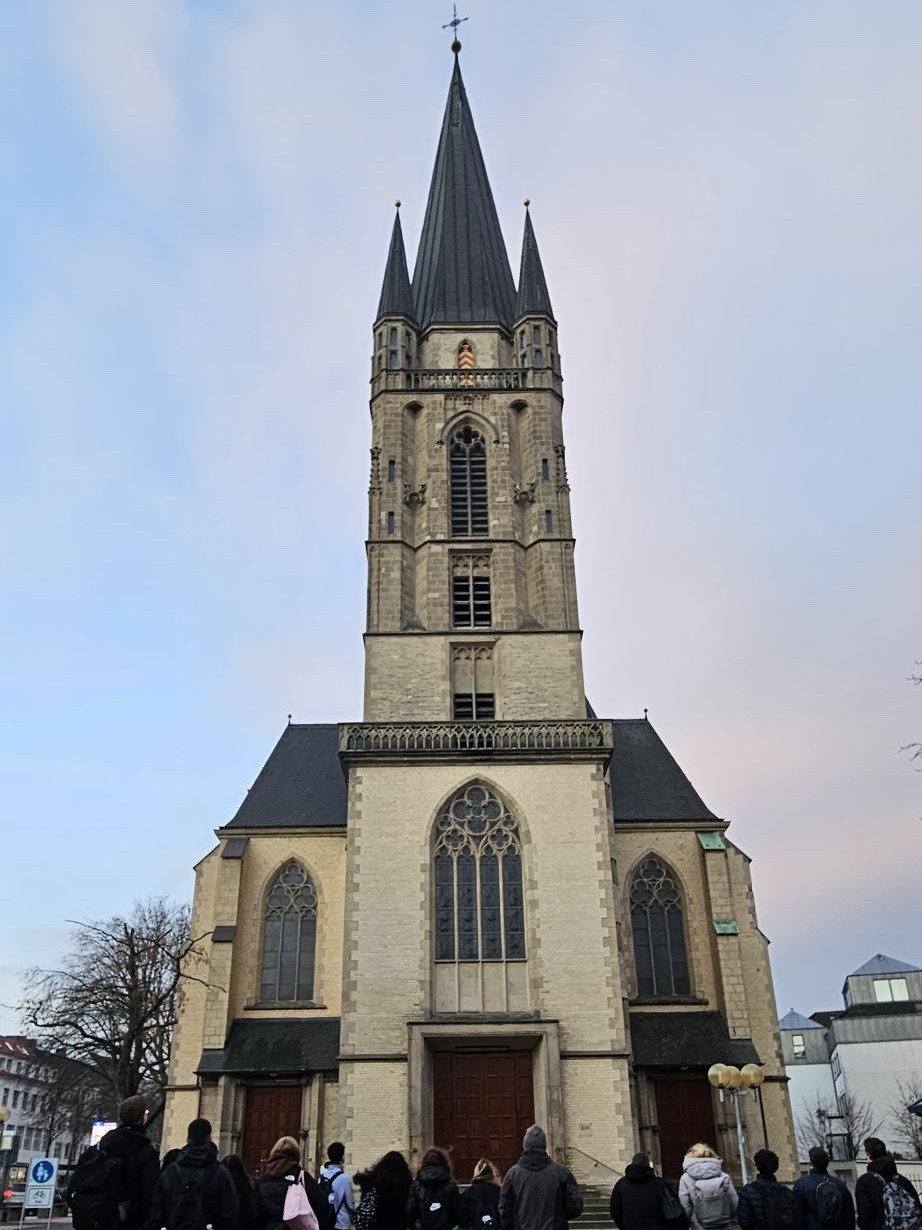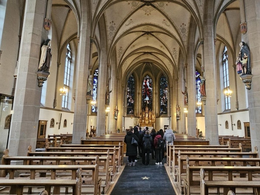Am Ende des ersten Halbjahres besuchte der Kurs Katholische Religionslehre der Jahrgangsstufe 10 im Rahmen der Unterrichtsreihe zur Symbolik und Architektur eines Kirchenraums die Herz Jesu Kirche in Paderborn. Bei eisigen Temperaturen am frühen Morgen waren die Schüler:innen froh, bereits vor Beginn der Kirchenführung im extra für die Gruppe beheizten Innenraum von Pastor Roland Schmitz herzlich empfangen zu werden. Zum Auftakt der Kirchenführung ging es jedoch zunächst noch einmal auf den Kirchenvorplatz. Dort ordnete Pastor Schmitz die Kirche in ihr städtebauliches Umfeld ein, erläuterte ihre Entstehungsgeschichte und wies auf charakteristische Merkmale der neugotischen Außenfassade hin. Anschließend setzte die Gruppe den Rundgang im Inneren der Kirche fort.