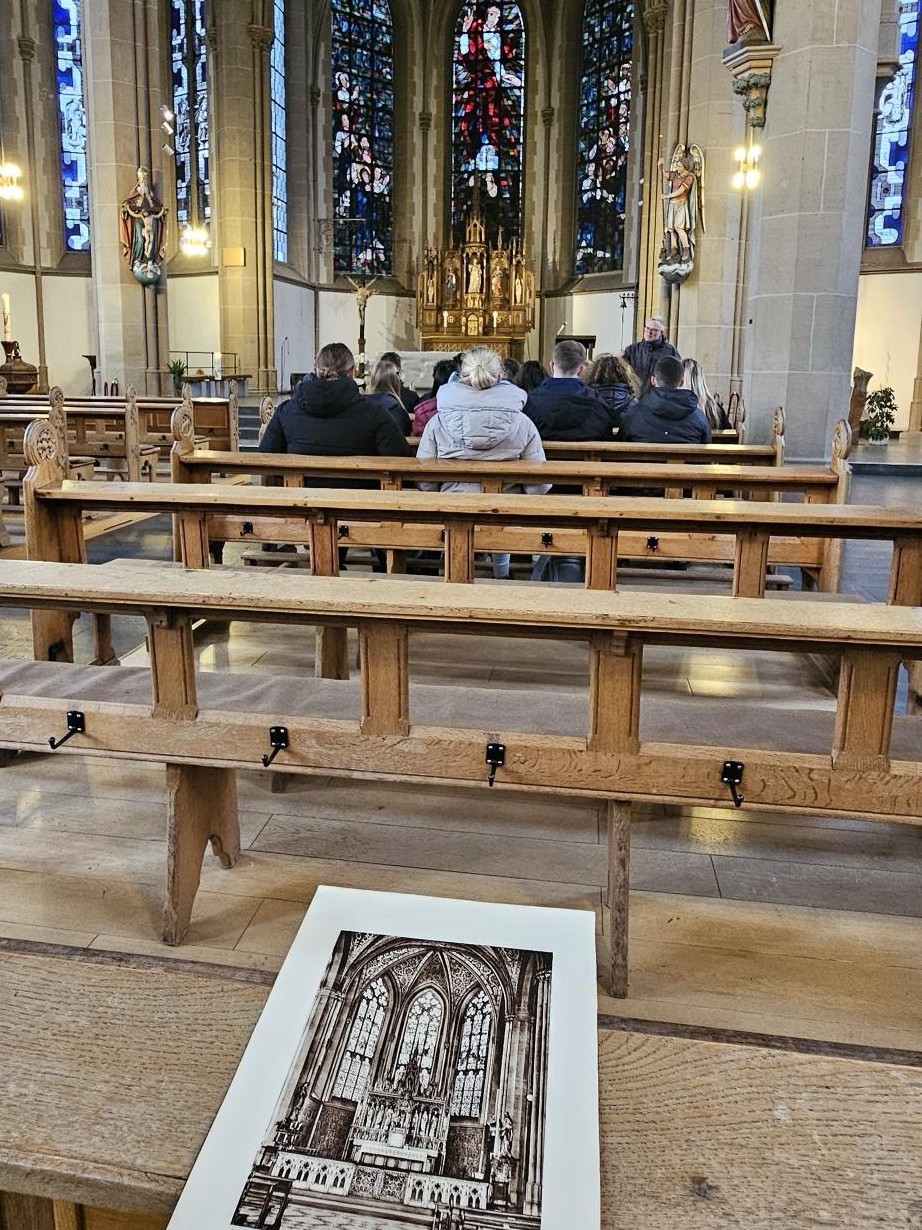 Ausgehend von der architektonischen Grundstruktur erklärte Schmitz die Symbolik zentraler Einrichtungselemente wie Altar, Ambo und Taufbecken und verdeutlichte deren Bedeutung im liturgischen Ablauf. Besonderes Interesse galt dabei auch dem Altar des Paderborner Künstlers Rikus, der moderne künstlerische Gestaltung und lokale Verbundenheit eindrucksvoll verbindet. Mit historischem Bildmaterial veranschaulichte der Pastor zudem die schweren Zerstörungen der Kirche im Zweiten Weltkrieg sowie den aufwändigen Wiederaufbau. Dieser Einblick machte deutlich, wie eng die Geschichte der Herz Jesu Kirche mit der Entwicklung der Stadt Paderborn verknüpft ist. Neu für die Jugendlichen waren auch seine Hinweise zur stimmungsvollen Illumination des Kirchengebäudes in der Weihnachtszeit, die jedes Jahr viele Besucher:innen anzieht.