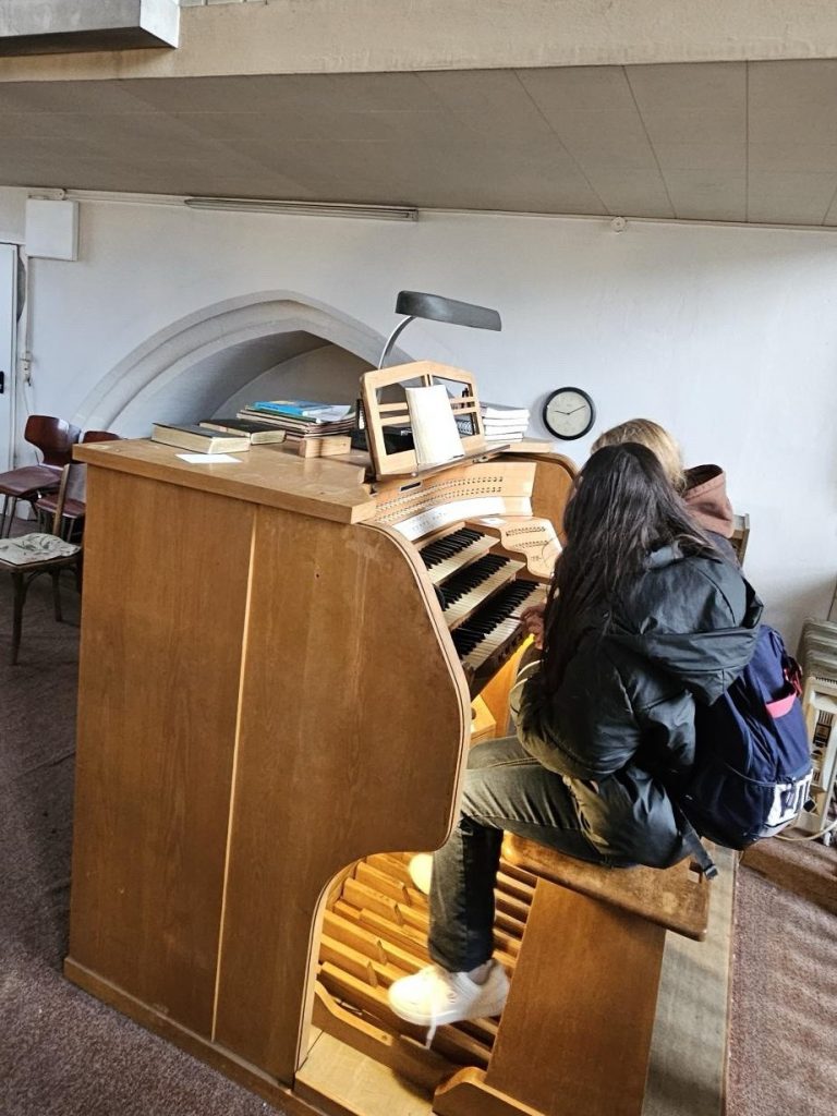 Ein besonderer Höhepunkt der Kirchenführung war schließlich der Aufstieg in den 65 Meter hohen Kirchenturm. Der weite Blick über die Dächer der Stadt und das seltene Erlebnis, das Läuten der großen Kirchenglocken aus nächster Nähe mitzuerleben, hinterließen einen nachhaltigen Eindruck – zumal eine solche Gelegenheit selbst Einheimischen nur selten zuteil wird. Ein kurzer Einblick in die Funktionsweise der Kirchenorgel und die Möglichkeit, einige Töne selbst zu spielen, rundeten das Erlebnis ab. Ein Schüler kommentierte stellvertretend für viele: „Der Blick aus dem Turm und das laute Läuten der Glocken waren unglaublich beeindruckend – sowas erlebt man nicht alle Tage.“ Für viele der Schüler:innen war der Besuch zugleich eine neue Perspektive auf einen Ort, der ihnen im Alltag zwar vertraut ist, jedoch meist nur als Gebäude auf dem Weg Richtung Einkaufsmeile wahrgenommen wird. Erst durch die Kirchenführung wurde bewusst, welche geschichtliche Tiefe, architektonische Besonderheit und kulturelle Bedeutung tatsächlich hinter diesem markanten Paderborner Kirchenbau stehen.